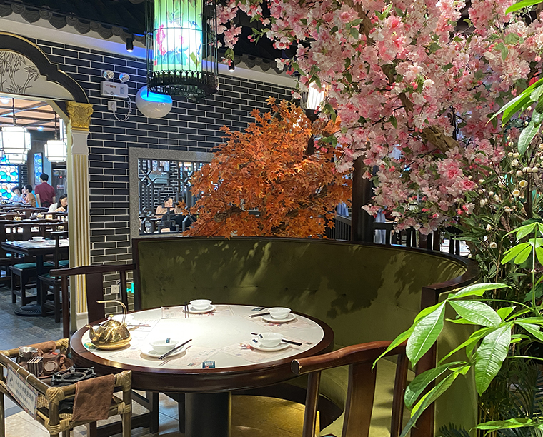 5、花藝綠植。綠化是室內(nèi)設計中經(jīng)常采用的裝飾手段,幾乎所有的餐飲空間都有綠化的裝扮。綠化在餐飲空間中的運用非常廣泛,不同的餐廳,花藝綠植的應用差別很大。一般的餐廳面積有限,綠植和花藝使用較少。主題類中餐廳,花園餐廳喜歡使用大量的花藝綠植,為了方便打理,花藝綠植都選用塑料花。品深設計策劃設計的蘩樓全天茶市,二小姐的店,都使用了不少花藝。其中二小姐的店選用的就是粉紅桃花,營造出了小橋流水,江南小鎮(zhèn)的感覺。