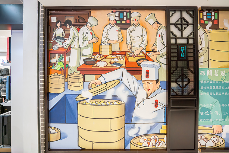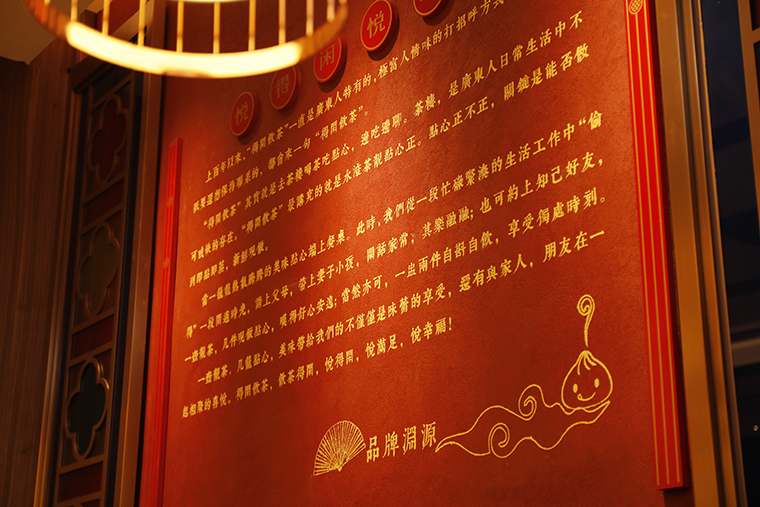 為了傳達(dá)蘩樓鮮做點(diǎn)心的核心優(yōu)勢,我們在品牌宣傳上不斷用口號“西關(guān)茗點(diǎn),蘩樓鮮做”強(qiáng)化訴求。同時(shí)創(chuàng)作了蘩樓點(diǎn)心師傅現(xiàn)場進(jìn)行點(diǎn)心鮮做的場景,從原材料到制作然后現(xiàn)蒸一一展示,把一個(gè)要用200字描述的場景,轉(zhuǎn)換成一張圖畫來表達(dá),真實(shí)具象地還原了“蘩樓鮮做”場景,讓顧客一下就記住了蘩樓鮮做的核心優(yōu)勢。品深餐飲設(shè)計(jì)將此畫面應(yīng)用到餐廳空間設(shè)計(jì)中,使之成為非常有效的傳播媒介。