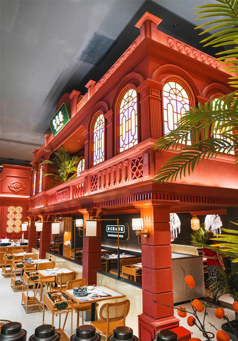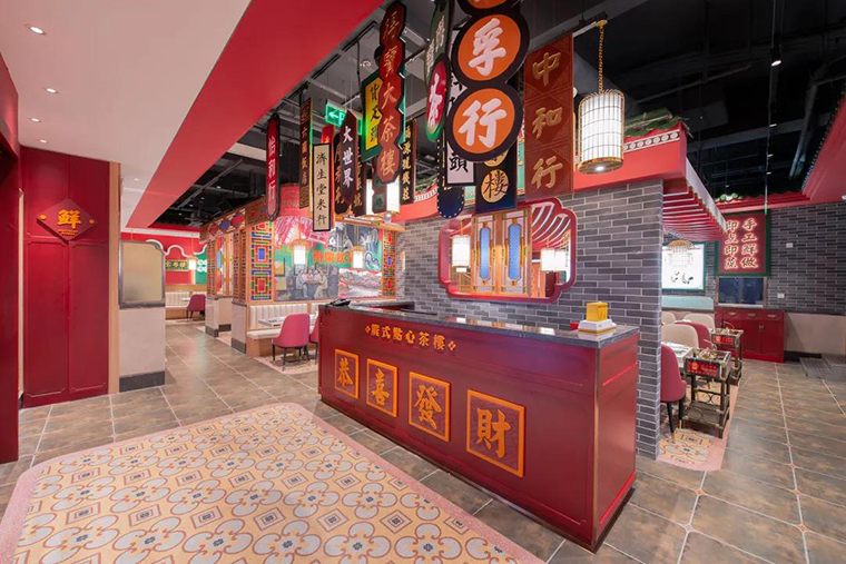 品深餐飲全案策劃設計的悅得閑廣式點心茶樓則從品牌本身出發,從“得閑飲茶”這一核心文化母體提取“閑”文化,整個空間裝飾以“一杯在手,半日清談”為主題,并大紅配大綠,富貴吉祥又添財氣為主色,很好的表現了廣式飲茶及點心文化,并與同品類形成了明顯的區分,形成了悅得閑自己獨有的風格。