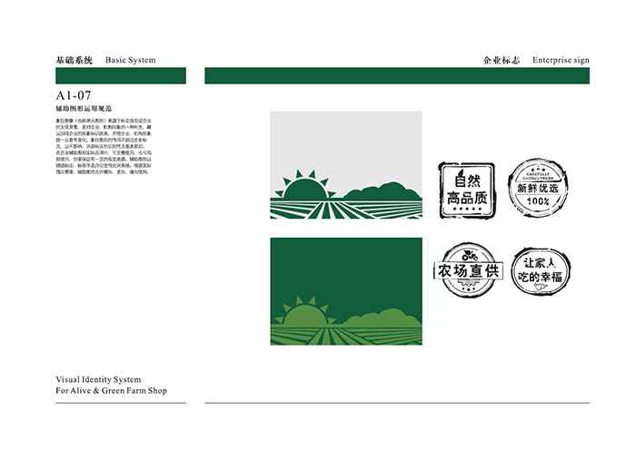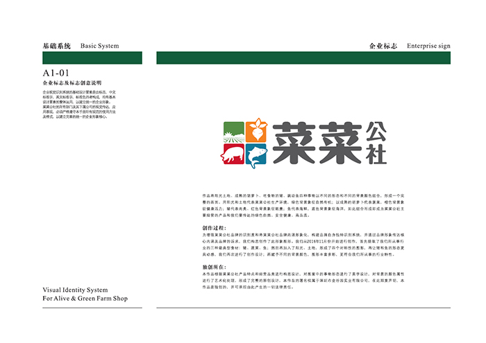 將陽光土地、成熟的胡蘿卜、吃食物的豬、跳動(dòng)魚四種事物以不同的形態(tài)和不同的背景顏色組合,形成一個(gè)完整的畫面。用陽光和土地代表菜菜鮮語生產(chǎn)環(huán)境,綠色背景象征自然有機(jī);以成熟的胡蘿卜代表蔬菜,橙色背景象征健康活力;豬代表肉類、紅色背景象征能量;魚代表海鮮,藍(lán)色背景象征海洋,如此組合而成即成為菜菜鮮語主要經(jīng)營的產(chǎn)品和我們要傳達(dá)的綠色自然、安全健康、高品質(zhì)。