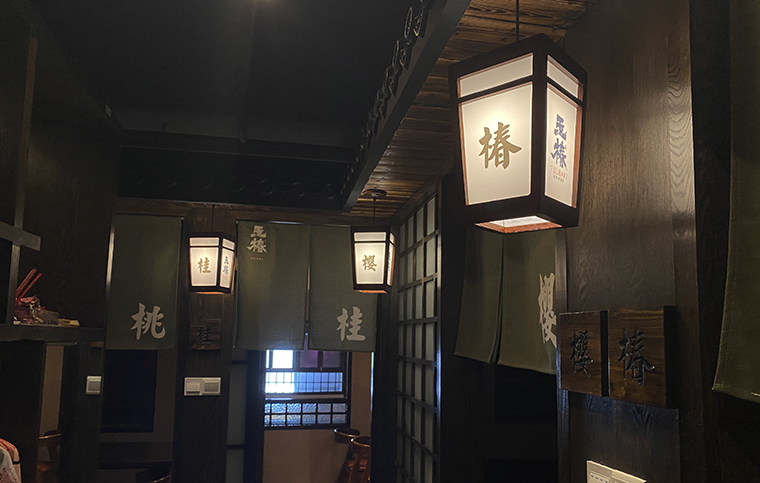 店內的各種吊燈也是日式最經典款式,在日本江戶時代是町家所用的,與品牌整個格調默默相融。吊燈上我們打上了日本六大名花:椿、櫻、桃、桂、梅、菊。既起到識別作用,又增強了品牌的文化底蘊。