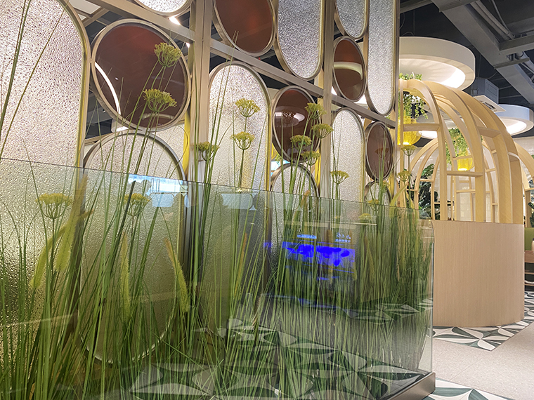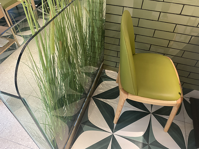 除了品牌的畫面及文案宣傳外,我們如何在空間裝飾方面突出這一核心賣點呢?我們想到了磨砂玻璃這一材質,在餐廳立面的隔斷、包間的墻體,我們使用了磨砂玻璃及玻璃方磚,這種材料在燈光照耀下,有一種晶瑩剔透的感覺,用裝飾材料特性表現菜品清湯這一核心特征,打造出時尚清新,通透舒適的空間感受。