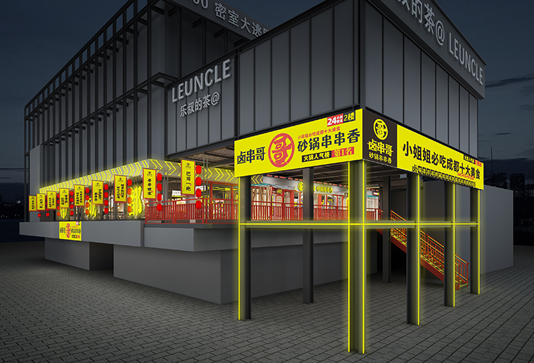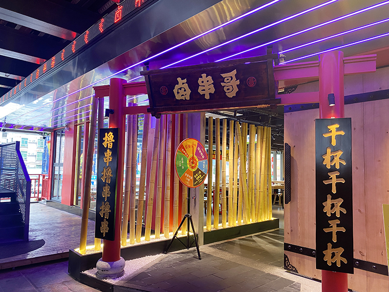 鹵串哥的好喝除了各種酒水飲料外,更有小姐姐最好吃的各種甜品。這也是鹵串哥與其他串串香火鍋產品結構及經營模式不同之處,此甜品還開設了對外售賣窗,為門店創造業績并吸引客流。品深餐飲全案團隊將鹵串哥甜品間的設計視為品牌的一大亮點,功能上設置了對外窗口,外觀用醒目的中國紅,裝飾設計上用傳統的屋檐造型來表現,視覺感非常強烈,極具吸引力。