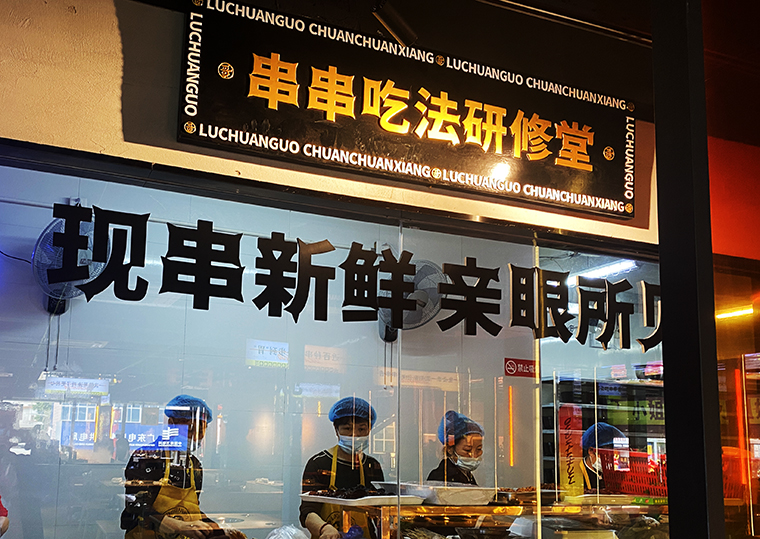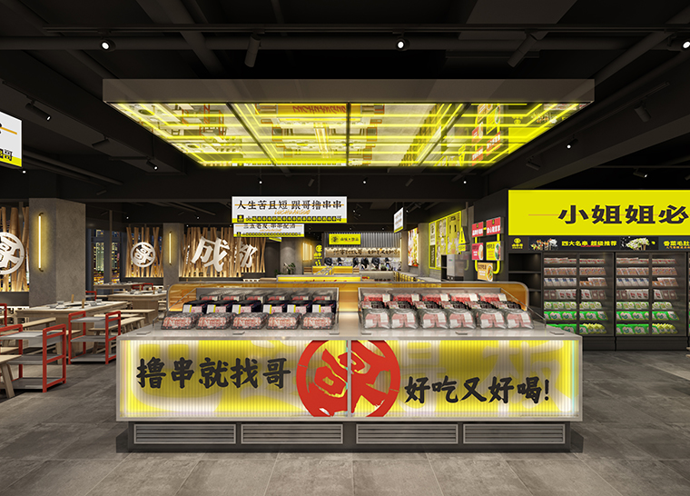 品深將其設計出連續長排展示,讓顧客有一種想征服美食的欲望。鹵串哥堅持的是串串每日新鮮現串,這是鹵串哥菜品的顯著特點,我們將其設計成明檔,命名為:串串吃法研修堂。讓顧客對新鮮能親眼所見。