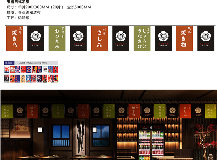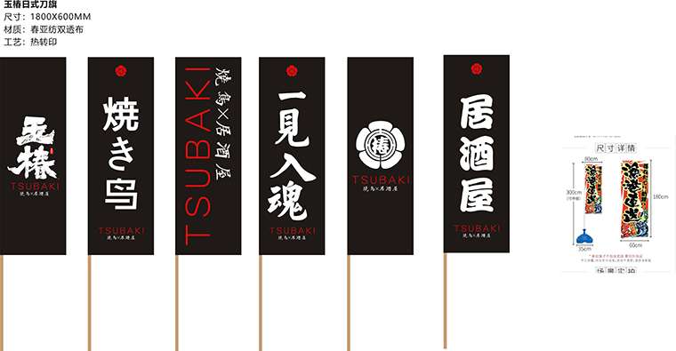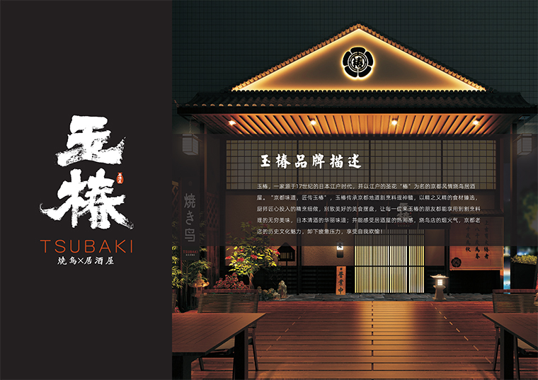 品牌記憶點(diǎn):日本京都風(fēng)格門(mén)頭設(shè)計(jì)+玉椿標(biāo)識(shí)及家徽+燒鳥(niǎo)手繪畫(huà)面+四大主色調(diào)。