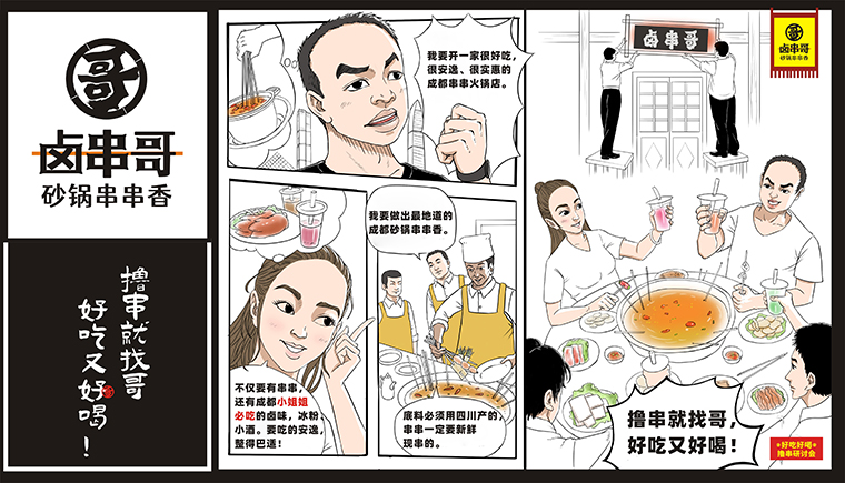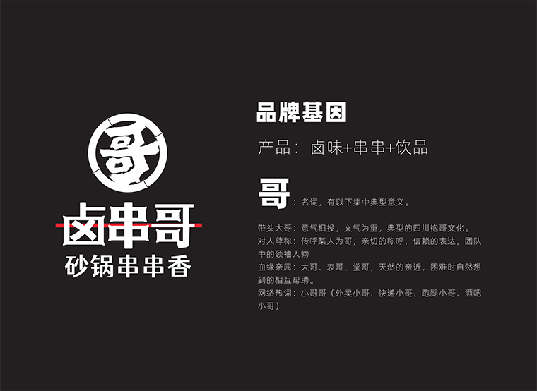 我們從鹵串哥品牌內(nèi)在基因出發(fā),提取升華了哥的文化,哥的符號。哥在四川既是表達(dá)親切信賴,尊重,也是袍哥文化,江湖義氣的表達(dá);同時(shí)哥還是負(fù)責(zé),擔(dān)當(dāng)?shù)囊庀螅桓邕€與當(dāng)下外賣小哥、快遞小哥、餐廳服務(wù)小哥的一種親切稱呼。
