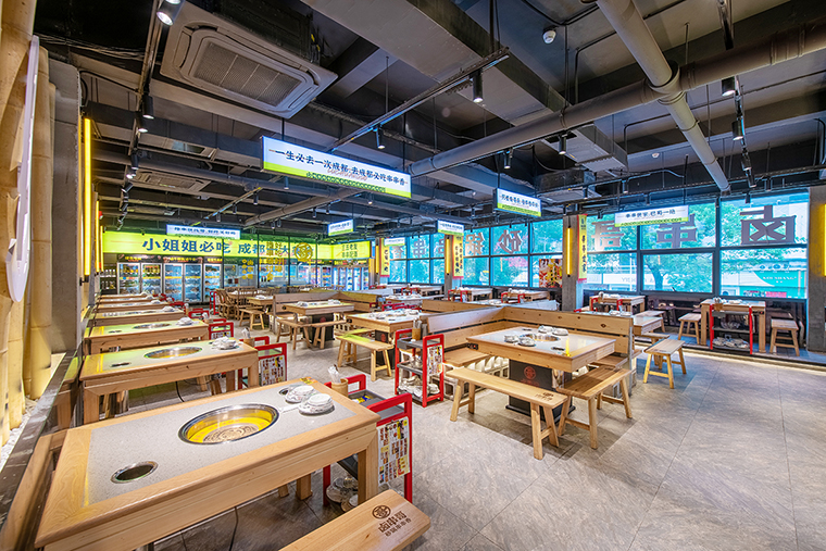 3、為了表現(xiàn)成都串串香火鍋店的市井氣息,我們?nèi)サ袅说蹴敚瑴p少立面造型,墻體使用了水泥面,還原出老成都串串香火鍋店的場景氣質(zhì),家具使用木質(zhì)卡座與條凳八仙桌,竹椅,此次門店還創(chuàng)造性地沒有使用吊燈,僅使用軌道射燈,整個(gè)空間硬裝修造價(jià)不到800元每平方米,是后疫情時(shí)期餐飲門店裝修投資最好方向。