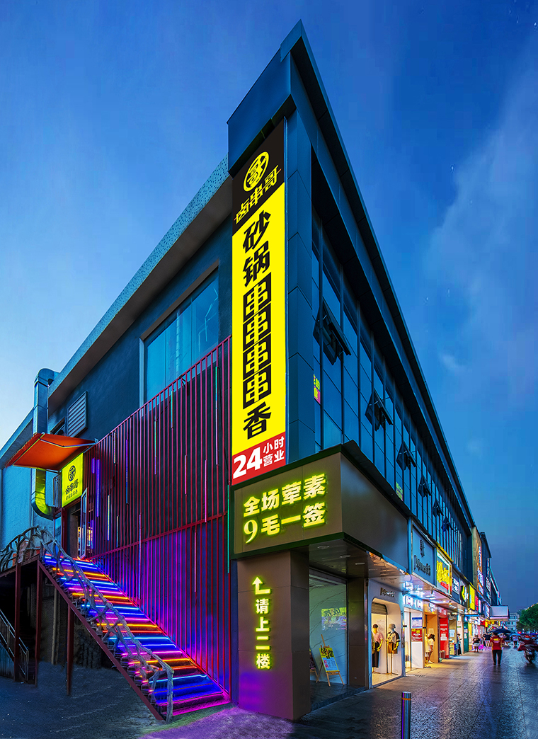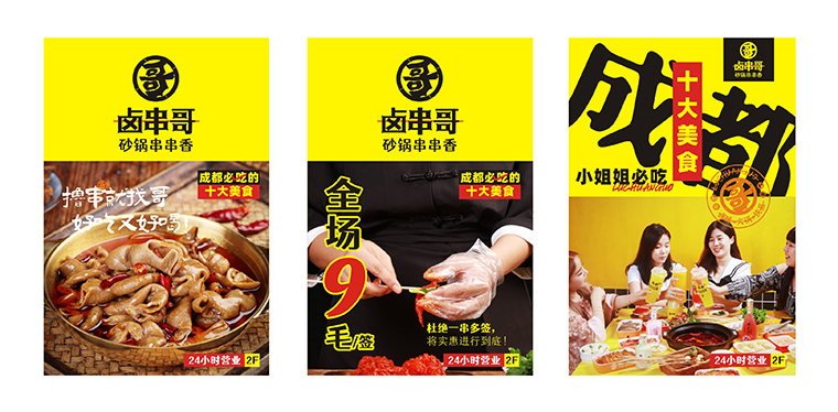 1、將門頭設(shè)計(jì)轉(zhuǎn)變成門面設(shè)計(jì),重點(diǎn)投入,反復(fù)推敲,裝修經(jīng)費(fèi)傾斜,用力猛一些。鹵串哥坪山店的整個(gè)外立面廣告招牌,設(shè)計(jì)非常大氣,覆蓋一整面墻,讓遠(yuǎn)遠(yuǎn)的顧客都能看見,門面上顧客可看見的地方不斷重復(fù)強(qiáng)調(diào)品牌核心訴求,如24小時(shí)營業(yè),地道成都砂鍋串串香,小姐姐必吃成都十大美食,9毛一簽等,讓門面成立吸引消費(fèi)者進(jìn)店的大利器。