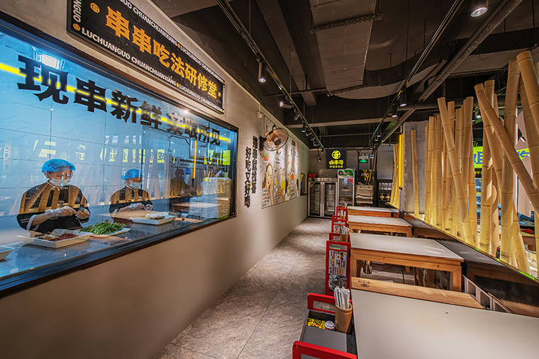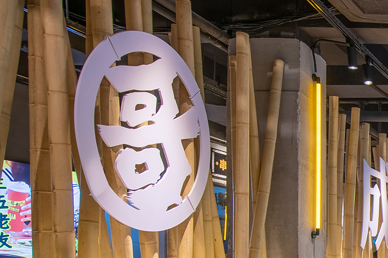 在空間中,我們用鹵串哥品牌強(qiáng)關(guān)聯(lián)的具體一個(gè)竹元素串聯(lián)整個(gè)裝飾,形成品牌專屬識別記憶,并與串串香的竹簽子,竹椅相呼應(yīng),既有品類特征,又是品牌文化的經(jīng)典傳達(dá)。